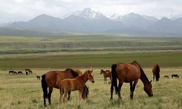 2020年6月13日,祁连山下的山丹马场草原上,绿草如茵,马群在返青的草原上悠闲觅食,构成夏日祁连山下美丽的牧马图。(陈礼摄)