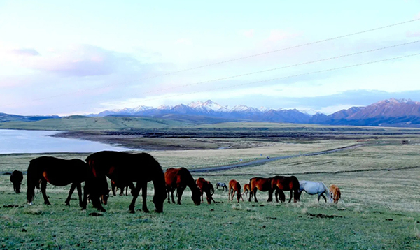 6月3日,马群在山丹马场一场草原上觅食。六月初的山丹马场草原虽然还处于青黄不接的时候,但已经绿草茵茵,马群在晨光中欢快的啃食着鲜嫩的青草芽,呈现出一派生机盎然景象。(记者陈礼摄)编辑:刘淑萍