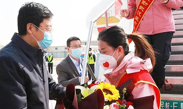 我市援助武汉医疗队第二批14名医护人员在完成医疗救治任务并进行休整后,于4月6日搭乘飞机返回张掖。市委副书记、市长谢又生到甘州机场迎接。河西学院党委书记赵凯,市委常委、市委宣传部部长李润强一同迎接。“