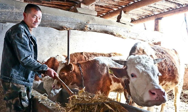 2020年3月16日,甘肃张掖甘州区甘浚镇东寺村的农户石作新正在给能繁母牛添加饲料。今年他养殖了14头母牛,繁育了牛犊6头,比去年增加收入8000多元。见到帮扶干部高兴的说;在家门口看到电视剧《一个都