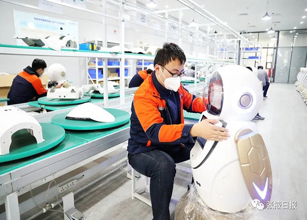 3月12日,张掖经济技术开发区内的智能制造产业园生产的创泽智能机器人生产线上,技术人员正在组装智能机器人。