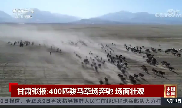 3月11日,中央电视台CCTV-4中文国际频道《中国新闻》、《今日环球》栏目分别播出了《甘肃张掖:400匹骏马草场奔驰场面壮观》的新闻,呈现祁连山下山丹马场“万马奔腾”的壮观景象。近日,甘肃张掖山丹马