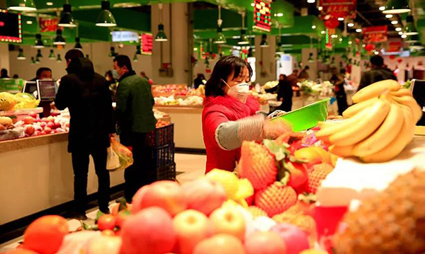 2020年2月13日早晨,张掖市润泉湖市场内肉、蛋、果、菜丰足,价格平稳。
