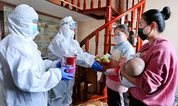 2020年2月1日,张掖甘州区金安宾馆穿着防护服的工作人员到游客杨学选房间给她和两个孩子送去了水果和小朋友们爱吃的零食。甘州区金安宾馆穿着防护服的工作人员到游客杨学选房间给她和两个孩子送去了水果和小朋
