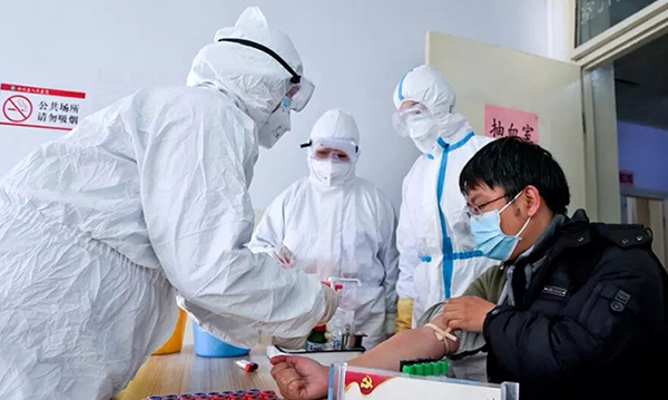 张掖甘州区人民医院5000平米留观隔离病区发热门诊医护人员正在给病人进行抽血化验。当日,甘州区人民医院将5000平方米原门诊办公楼改造成36间集预检分诊、发热门诊、留观病人为一体的留观隔离病区正式投入