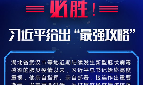 湖北省武汉市等地近期陆续发生新型冠状病毒感染的肺炎疫情以来,习近平总书记始终高度重视,他亲自指挥,亲自部署,接连作出重要指示,发表重要讲话,为打赢这场疫情防控阻击战给出“最强攻略”。